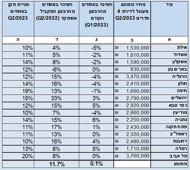להלן טבלת ריכוז של המחיר הממוצע לפי ערים לדירות בנות ארבעה חדרים (חדשות ויד שניה) ומגמות ההשתנות ברבעון השני לשנת 2023: