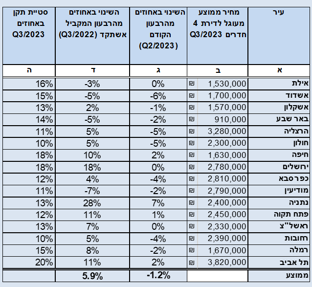 להלן טבלת ריכוז של המחיר הממוצע לפי ערים לדירות בנות ארבעה חדרים (חדשות ויד שלישיה) ומגמות ההשתנות ברבעון השלישי לשנת 2023:
