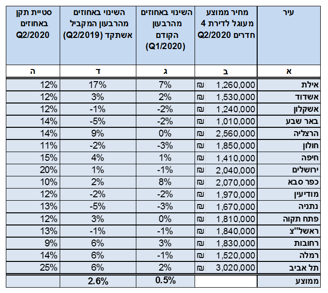 להלן טבלת ריכוז של המחיר הממוצע לפי ערים לדירות בנות ארבעה חדרים (חדשות ויד שניה) ומגמות ההשתנות ברבעון השני לשנת 2020: